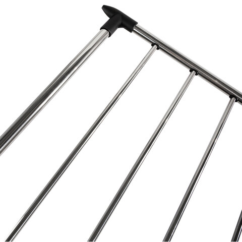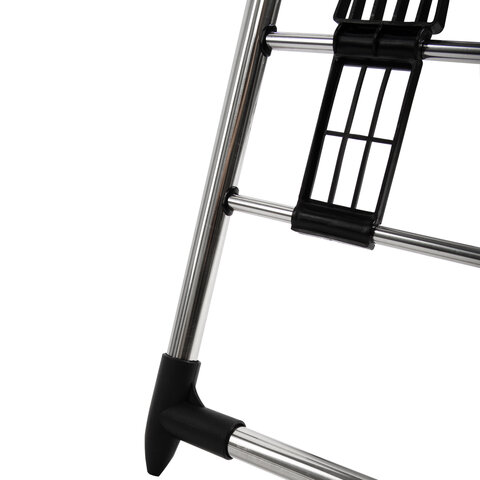 Сушилка для белья изготовлена из высококачественных прочных материалов, что обеспечивает ее устойчивость и мобильность. Все углы сушилки плавно и аккуратно скруглены. Ножки оснащены пластиковыми накладками для защиты пола от царапин и предотвращения скольжения сушилки по поверхности.