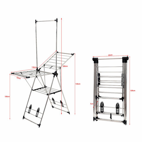 Размер – 49х109х7 см в сложенном виде и 200х136х49 см (максимальная ширина с учетом вращающих механизмов – 62 см) со всеми разложенными створками. Выдерживает нагрузку до 40 кг. Устойчивая, вместительная и компактная в хранении, при необходимости быстро и легко складывается и убирается. Заменяет до 18 метров бельевой веревки!
