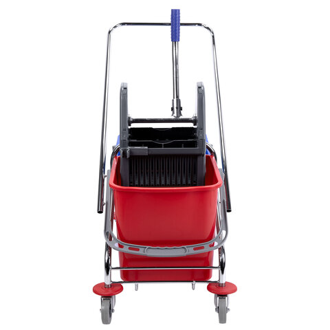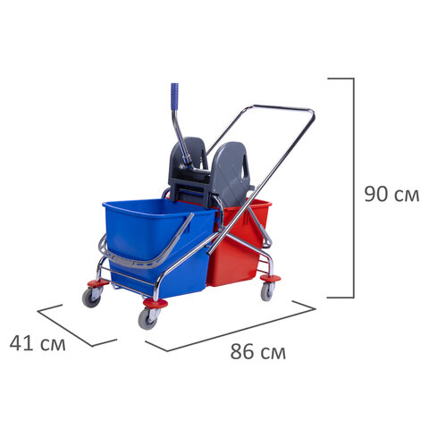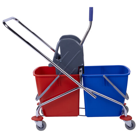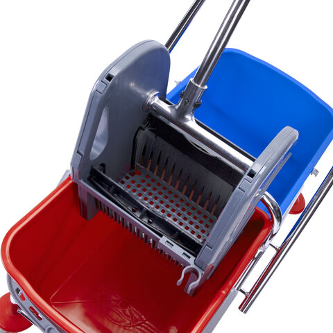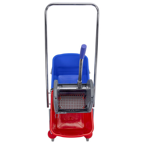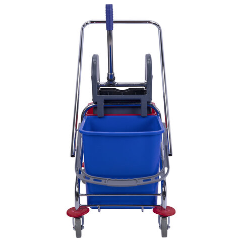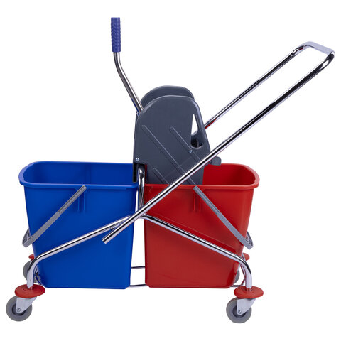 Представляет собой металлический каркас с установленными на него механическим отжимом для петельных тряпок и МОПов и 2 съемными ведрами с пластиковыми ручками по 25 л (рекомендованный объем каждого ведра - 20 л). База изготовлена из качественного пластика и металла, а инвентарь - из пластика. Тележка выполнена в трехцветном исполнении: красный, синий и серый. Колеса позволяют перемещаться в произвольном направлении. Имеются защитные диски на колесах.